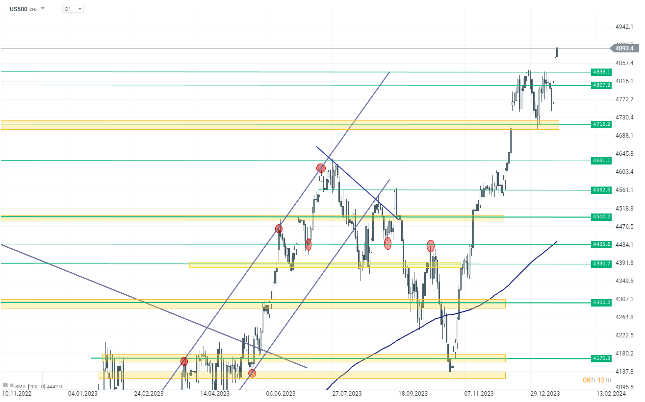 Aujourd'hui, le US500 a gagné 0,45 % après avoir atteint de nouveaux sommets historiques en fin de semaine dernière. Actuellement, le US500 se maintient juste en dessous de 4900 points. Le premier niveau à observer en cas de correction est le niveau supérieur de la dernière consolidation, c'est-à-dire 4830-4840 points.