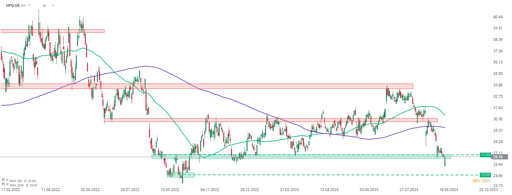 HP (HPQ.US) a ouvert en baisse aujourd'hui et le sentiment négatif à l'égard de l'action est alimenté par la révélation de Berkshire Hathaway concernant la vente d'une partie des actions de la société. Le cours de l'action est en train de franchir la zone de support des 27,00$ aujourd'hui. Source: xStation5