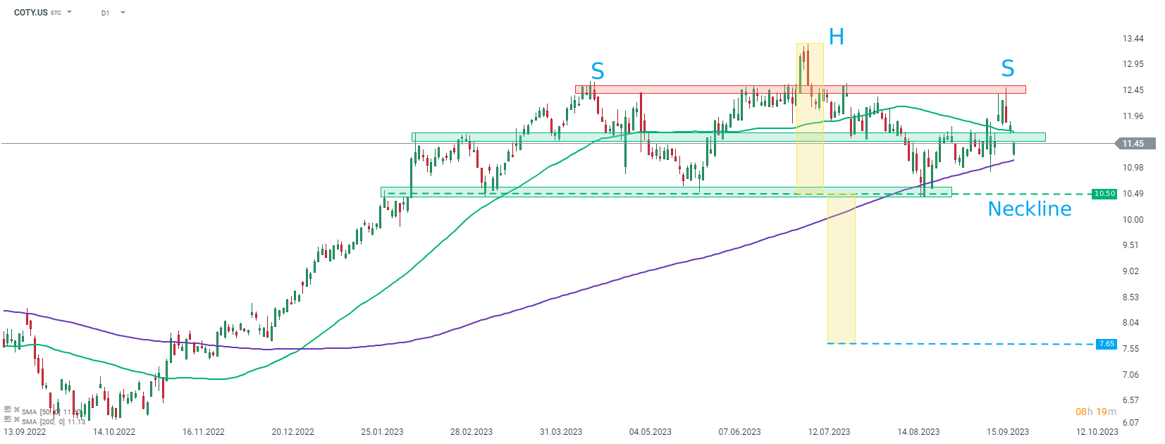 Coty (COTY.US) a commencé la séance d'aujourd'hui à la baisse suite à l'annonce d'une importante offre d'actions. Une configuration potentielle de tête et d'épaules peut être repérée sur le graphique et si les baisses s'accentuent et que le titre tombe en dessous de la ligne de cou dans la zone des 10,50 $, un plongeon jusqu'à 7,65 $ pourrait s'ensuivre (fourchette classique de la configuration). Source : xStation5