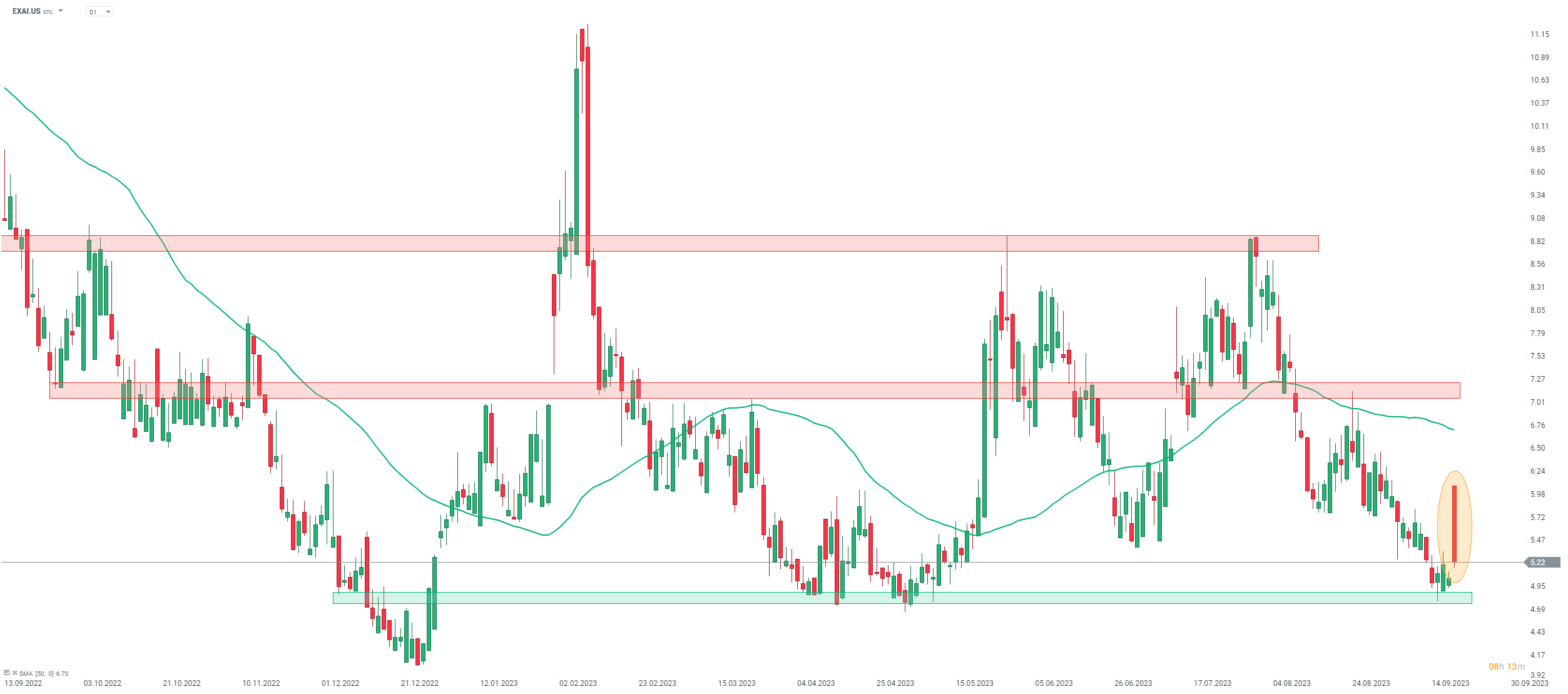 Exscientia (EXAI.US) a démarré la séance d'aujourd'hui avec un écart de prix haussier de plus de 20 % à la suite d'informations sur la collaboration avec Merck KGaA. Cependant, une grande partie de ces gains a été effacée après le lancement de la séance et le titre ne se négocie plus qu'à 5% sur la journée. Source: xStation5