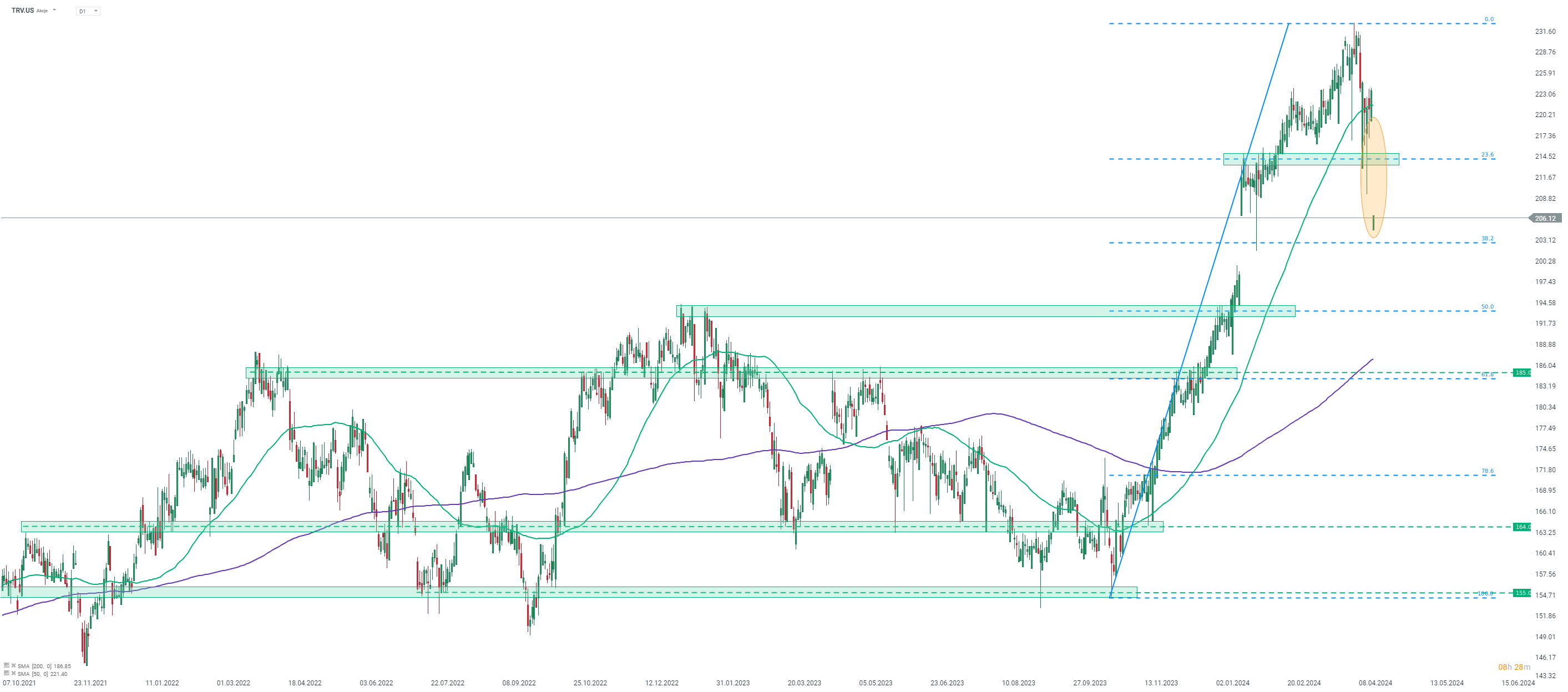 Travelers (TRV.US) a commencé la séance d'aujourd'hui à la baisse suite à la publication de résultats décevants pour le premier trimestre. L'action a chuté en dessous de la zone de support dans la région de 214$ marquée par le retracement de 23,6% du mouvement haussier lancé fin octobre 2023 et a atteint le niveau le plus bas depuis fin janvier 2024. Source: xStation5
