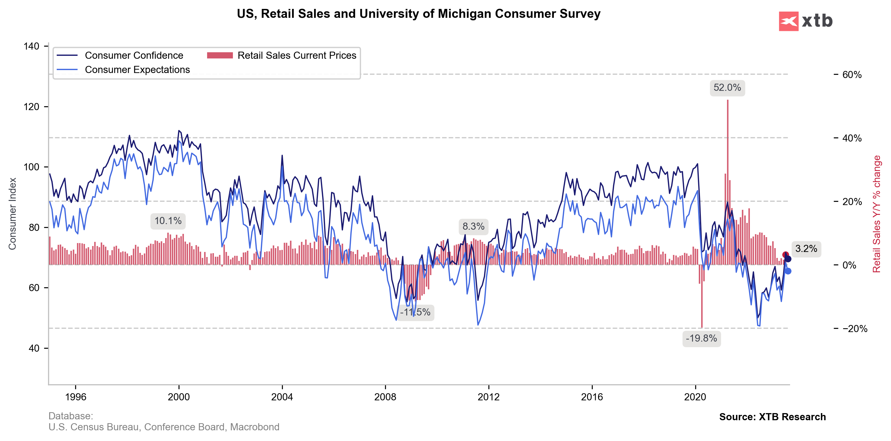 Pendant ce temps, des données de l'Université du Michigan concernant le sentiment des consommateurs et l'inflation attendue ont également été publiées. Les données n'ont pas apporté de surprises significatives. Les attentes d'inflation ont légèrement augmenté, avec une prévision à un an de 3,5% et une prévision à 5 ans de 3,05%. Le sentiment des consommateurs s'est avéré quelque peu moins bon, restant en deçà des attentes à 69,5 par rapport à un 71,2 attendu. Une détérioration supplémentaire du sentiment des consommateurs pourrait impliquer une baisse continue des ventes au détail, qui avaient jusqu'à présent exceptionnellement bien performé.