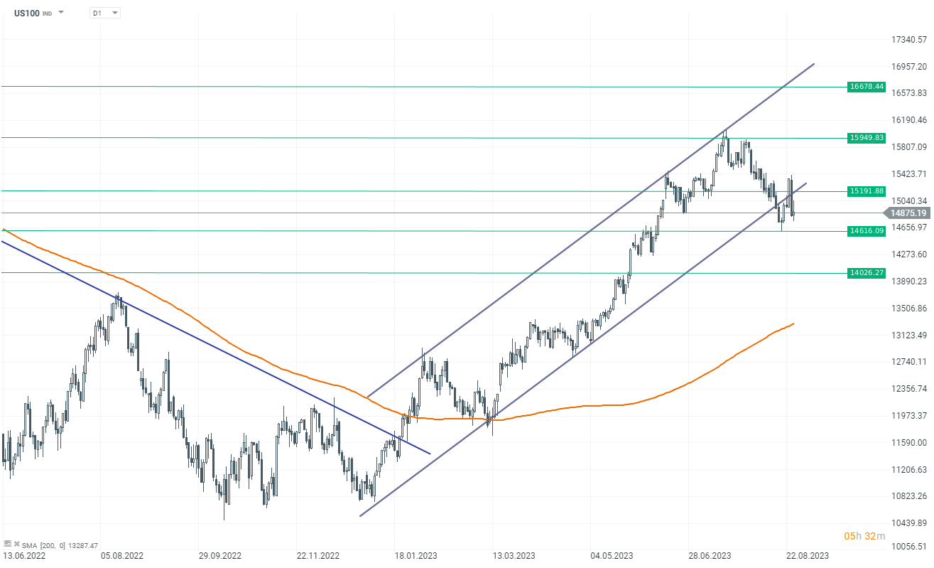 La première partie de la session d'aujourd'hui à Wall Street a été marquée par des sentiments variables, influencés par le discours du président de la Fed, Jerome Powell, lors du Symposium de Jackson Hole dans le Wyoming. Initialement, les principaux indices américains ont ouvert en légère hausse. Les gains se sont poursuivis après le début du discours du président de la Fed à 16h05. Cependant, pendant le discours, un ton hawkish s'est manifesté. Les indices ont réagi par des chutes soudaines, et le dollar s'est renforcé. Actuellement, nous observons une continuation des sentiments modérés, bien que dans un ton plus apaisé qu'après le discours. L'US100 est négocié à 0,20% en dessous, et l'US500 se négocie autour des niveaux d'ouverture.