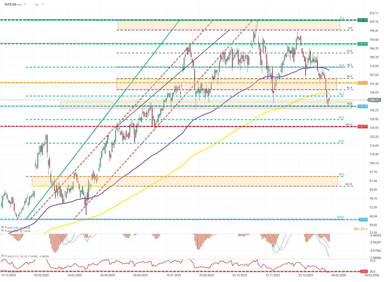 Depuis son sommet, PLTR a perdu plus de 25%, ce qui pourrait suggérer une purge saine. Pourtant, avec une capitalisation supérieure à 340 milliards de dollars et un ratio P/E au-delà de 300, le titre reste dans une catégorie à part.