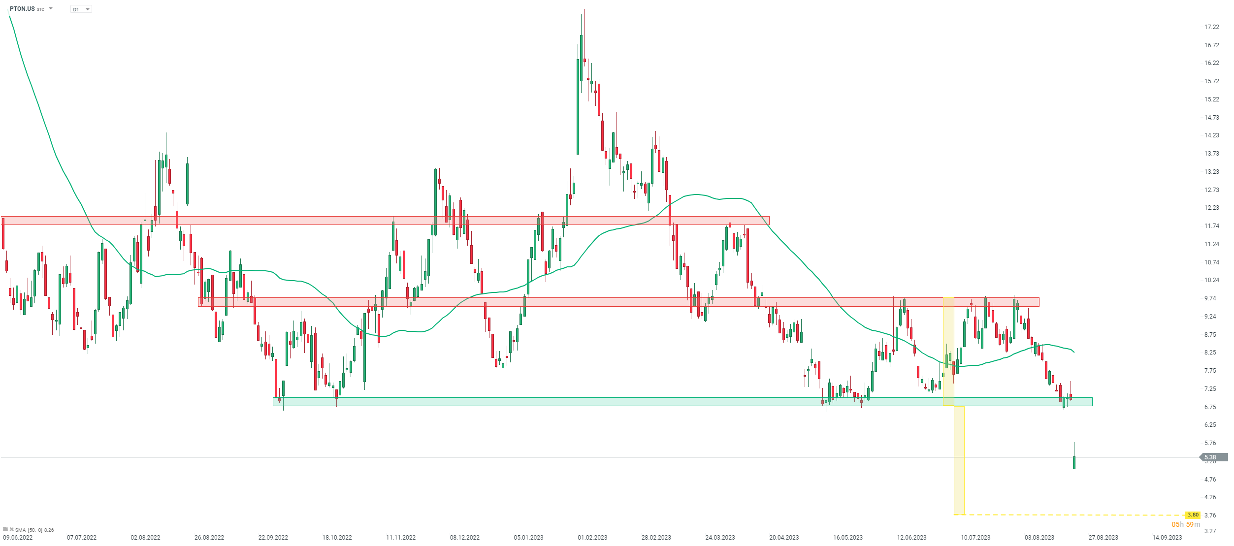 Peloton Interactive (PTON.US) est l'une des actions américaines les moins performantes aujourd'hui. Les actions de l'entreprise chutent de plus de 20% suite à la publication du rapport sur les résultats du quatrième trimestre fiscal 2023 (deuxième trimestre calendaire 2023).