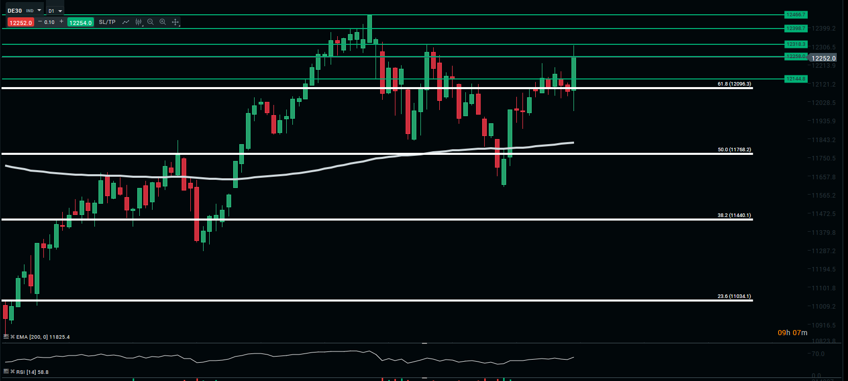 Le DAX30 a rallié les 12 318 points. Le seuil des 61,8 % des retracements de Fibonacci a été franchi soutient l’élan. Au moment nous rédigeons cette note, les vendeurs sont parvenus à faire baisser le cours au niveau des 12 254 points.