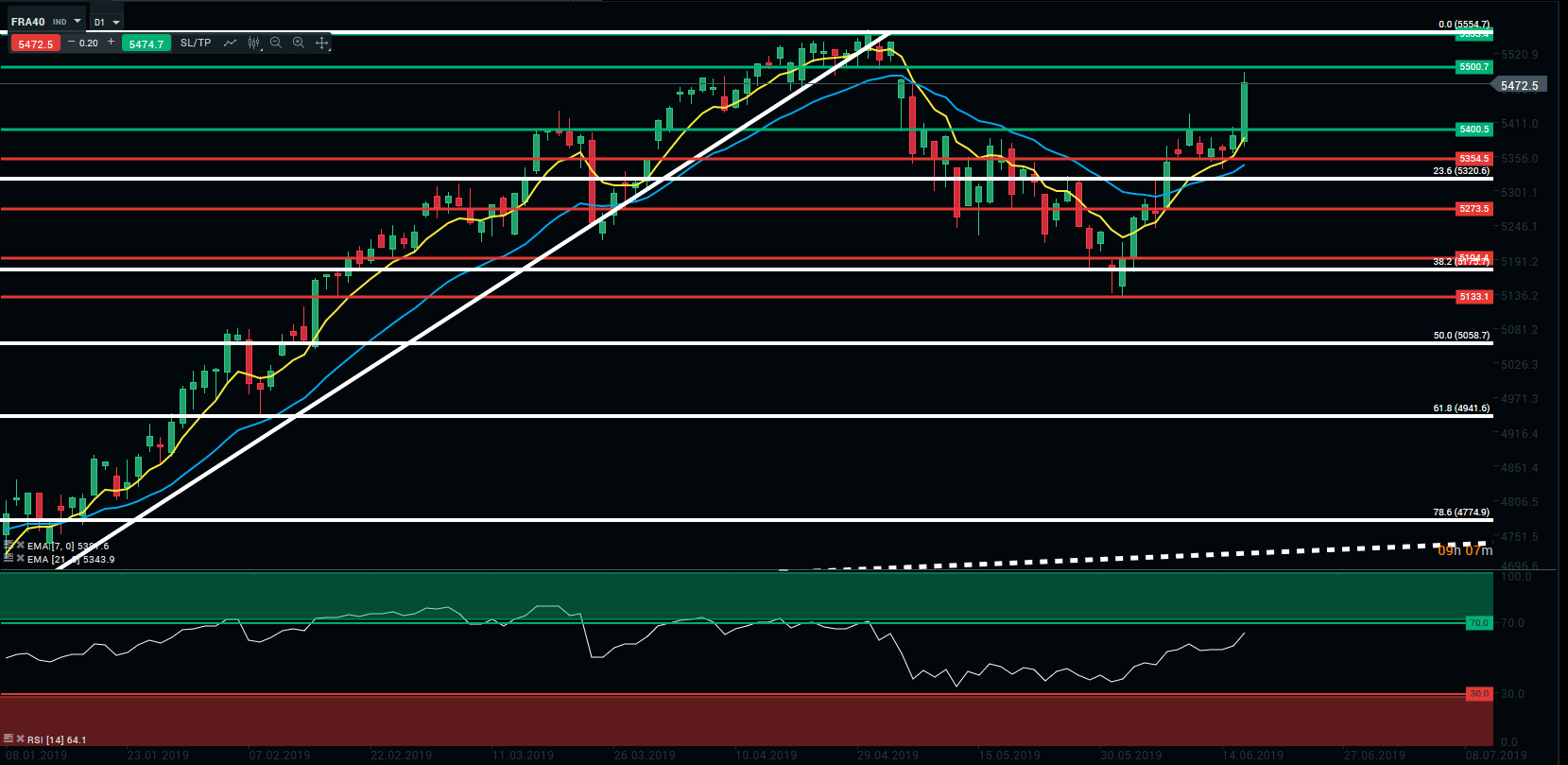 Après plusieurs tentatives infructueuses, le CAC40 est parvenu à s’affranchir des 5 400 points. Dorénavant, les cours testent les 5 500 points. Les vendeurs essayent de profiter de l’épuisement de la hausse pour prendre la main.