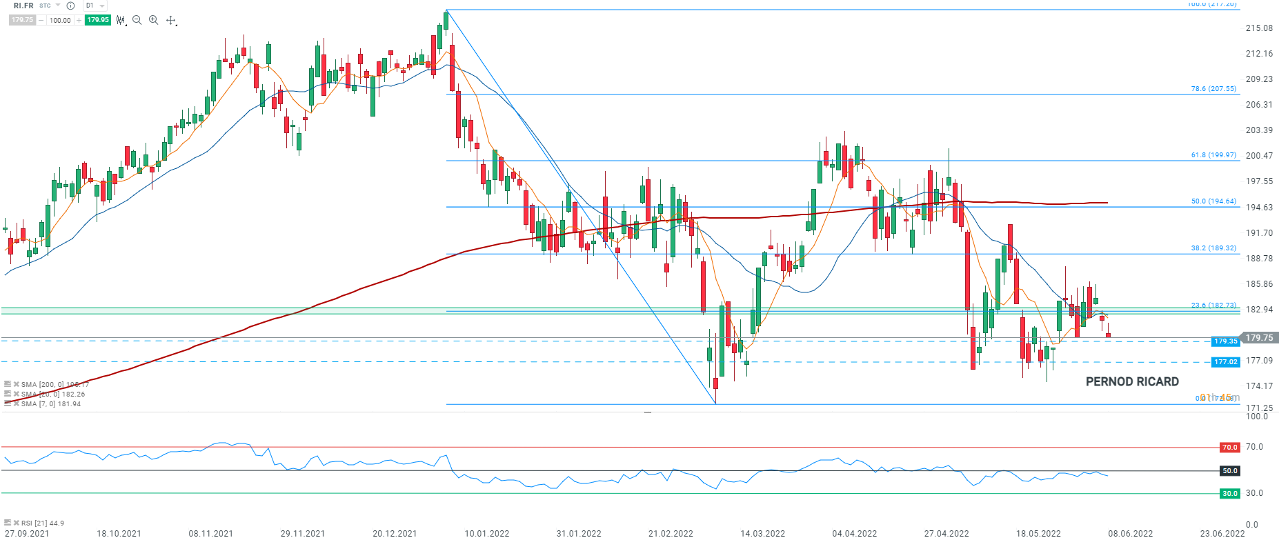 Les cours de Pernod Ricard (RI.FR) ont entamé la séance d’aujourd’hui à la baisse, se dirigeant vers le support à 179,35. En cas de cassure de ce niveau, le mouvement baissier pourrait s’étendre en direction du support à 177,02. On remarque d’un point de vue technique que le RSI évolue en dessous de la zone de neutralité ce qui signifie que les vendeurs ont toujours l’avantage. Source : xStation5