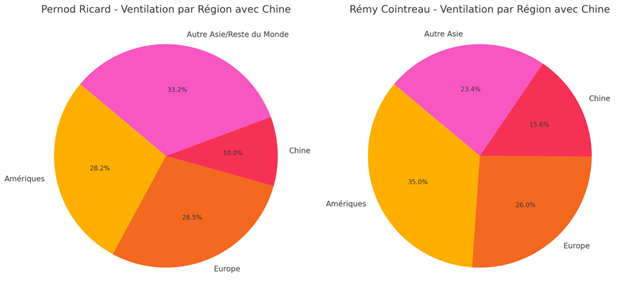 Bien que les deux entreprises soient confrontées à des défis similaires, Pernod Ricard semble mieux armé pour y faire face. Le groupe est non seulement plus diversifié géographiquement, mais également au niveau de ses produits. Les marques internationales et stratégiques représentent 64 % des revenus de Pernod Ricard contre 89 % pour Rémy Cointreau. De plus, en cas de sanctions chinoises sur les importations de cognac, Rémy Cointreau serait davantage impacté, avec 25 % de son portefeuille dédié au cognac (contre 8-9 % pour Pernod Ricard), et la Chine représentant 15,6 % de ses ventes (contre 10 % pour Pernod Ricard). Ces sanctions s'inscrivent en réponse à l'ouverture par la Commission européenne d'une enquête sur les subventions accordées par la Chine aux constructeurs de véhicules électriques, leur conférant un avantage concurrentiel. Pernod Ricard et Rémy Cointreau pourraient être parmi les premières entreprises ciblées par les autorités chinoises, et pourraient être contraintes de revoir à la baisse leur politique tarifaire.