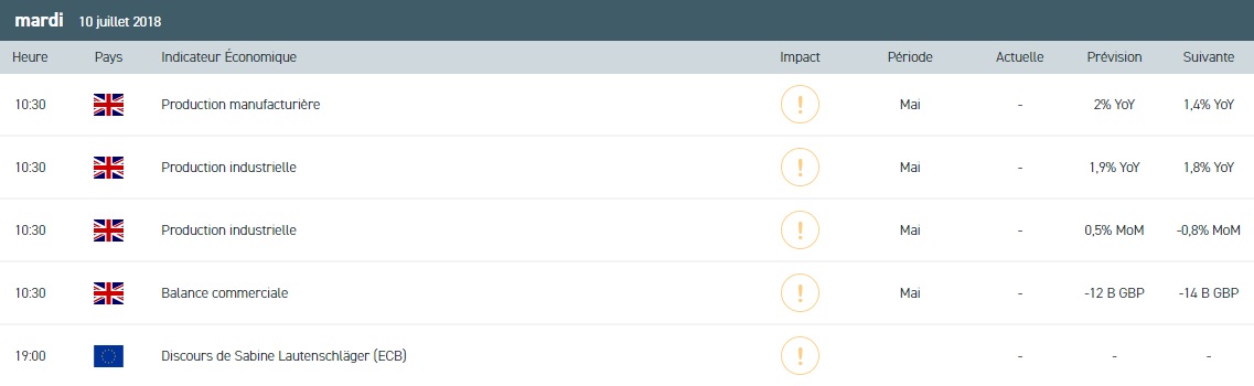 Pour l’heure, les marchés européens évoluent en territoire positif dans le sillage de Wall Street et de Tokyo. Concernant le calendrier économique de ce mardi, nous prendrons connaissance d’une salve de statistiques économiques au Royaume-Uni. En effet, nous nous intéresserons à l’évolution de la production industrielle et manufacturière pour le mois de mai. Dans le même temps, nous assisterons à la publication du produit intérieur brut (PIB) du premier trimestre et de la balance commerciale du mois de mai. En Allemagne, nous nous focaliserons sur l’indice ZEW de confiance des investisseurs au titre du mois de juillet. Sur le front des entreprises, la saison des résultats du deuxième trimestre débutera cette semaine avec les publications de JP Morgan Chase, Wells Fargo, et de Citi Group. Pour l’heure, les investisseurs et les analystes anticipent une croissance des bénéfices de l’ordre de 20,7 % sur la période avril-juin.