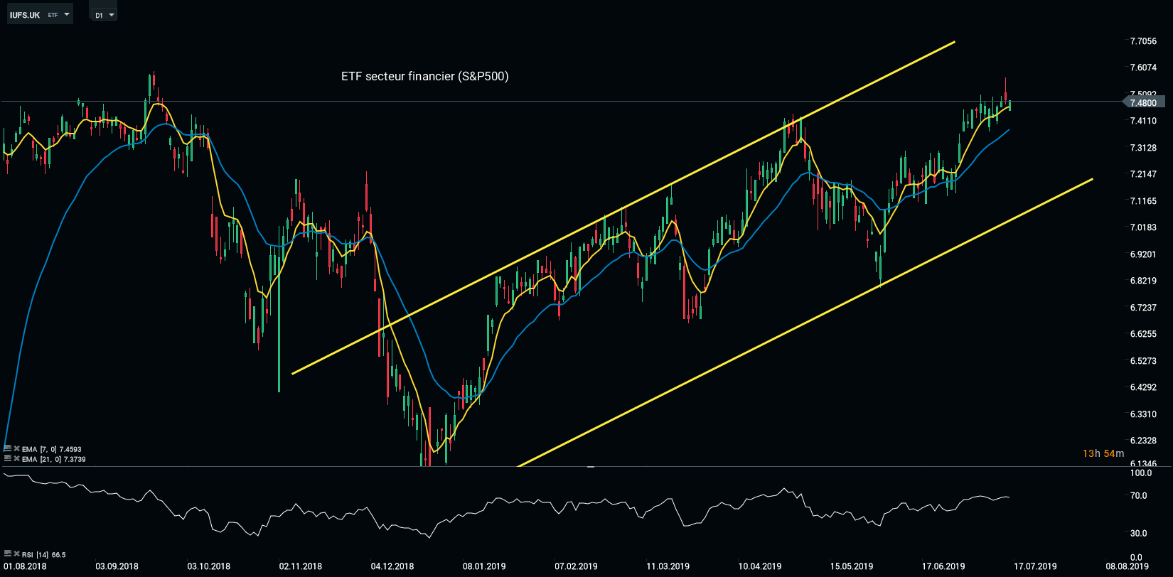 Représentation technique de l’ETF du secteur financier américain, en D1