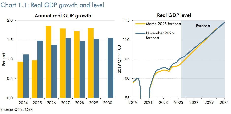 Le PIB réel devrait ressortir plus haut que prévu en 2025, avant d'être revu à la baisse à partir de 2026. Source: Haver Analytics, OBR