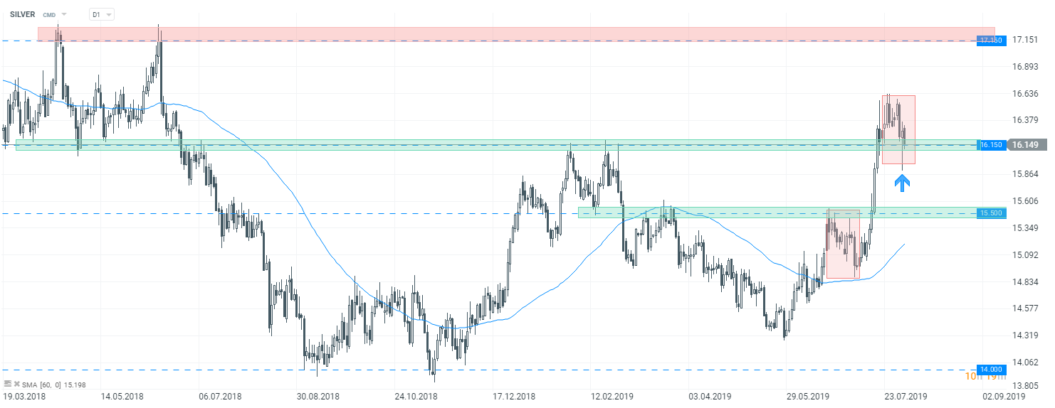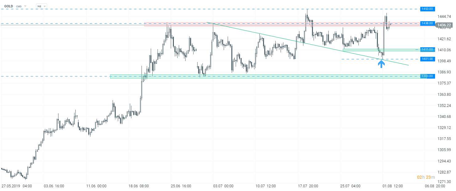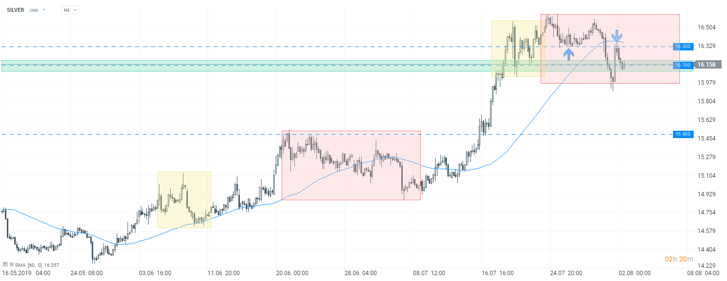 La volatilité sur le marché a augmenté en raison de la décision de Trump d’imposer des droits de douane de 10% sur 300 milliards de dollars de produits chinois. Des mouvements de prix importants ont été observés sur la plupart des marchés hier. L'or a gagné 1.2% hier et l'argent a terminé la journée en hausse de 0.14%. Regardons les graphiques. Dans le cas de l'or, la session d'hier s'est terminée sur un gain. La première moitié de la séance fut calme, mais après 15 h 00, le marché a repris la tendance haussière antérieure. Une volatilité maximale a été repérée en soirée au moment de l’annonce de Trump. L'or a également vu l'élan à la hausse s'accélérer à ce moment-là. La fermeture du chandelier quotidien laisse entrevoir la possibilité de prolonger le mouvement ascendant. Le marché se négocie peut-être à la baisse aujourd'hui, mais gardez à l'esprit que, tant que le prix se maintient au-dessus du seuil de 1 411 $, la tendance à la hausse reste le scénario de base. À l’heure actuelle, les taureaux tentent d’arrêter le déclin autour de 1438 $, point de départ d’un autre mouvement haussier.