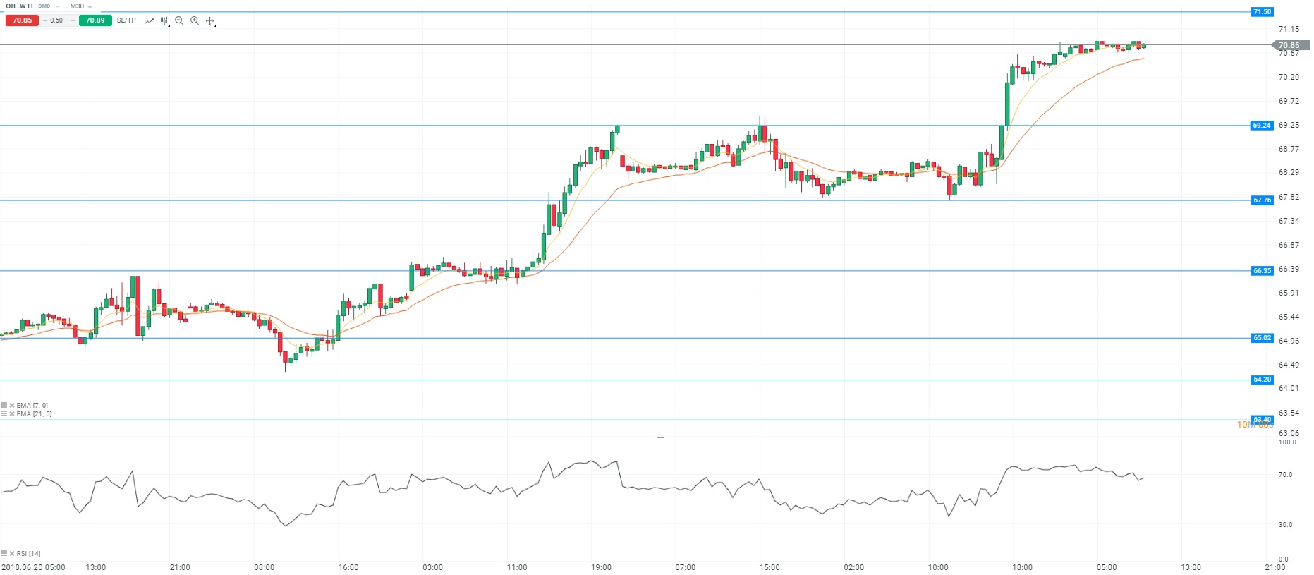 Sur le plan des matières premières, le contrat WTI a terminé en forte hausse de 3,6% au niveau des 70,53 dollars le baril. Les Etats-Unis ont demandé à leurs alliés de suspendre leurs importations de pétrole iranien d’ici au 4 novembre. Aucune exemption ne sera octroyée. Tout pays qui ne respecterait pas cette mesure s’exposera à des sanctions américaines. Dans le même temps, l’Arabie Saoudite pourrait augmenter sa production journalière jusqu’à 11 millions de barils au mois de juillet. Enfin, l’American Petroleum Institute a fait état d’une forte contraction des stocks de pétrole de 9 millions de barils pour la semaine terminée au 22 juin. D’un point de vue technique, les prix évoluent autour de la moyenne mobile courte (à 7 périodes) en unité de temps M30. Le RSI est stable dans sa zone de surachat. En conclusion, nous avons un biais acheteur avec comme objectif le niveau des 71,5 dollars le baril.