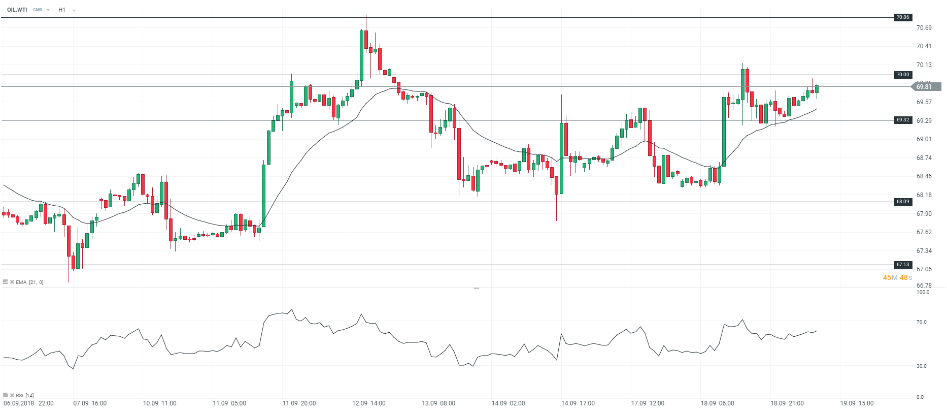 D’après l’American Petroleum Institute (API), les stocks de brut ont augmenté de 1,25 million de barils pour la semaine terminée au 14 septembre aux Etats-Unis. Evidemment, cette donnée devra être confirmée ce jour par le département de l’Energie (DoE). Au moment où nous écrivons ces lignes, le consensus anticipe une contraction des stocks de brut de 2,7 millions de barils et de 104 000 barils pour les stocks d’essence. En revanche, les stocks de produits distillés sont attendus en hausse de 651 000 barils. D’un point de vue technique, la toile de fond est positive en unité de temps 30 minutes (M30). Nous notons que les prix sont soutenus par différentes moyennes mobiles à court terme. C’est pourquoi, nous avons un biais positif sur l’actif et estimons qu’il devrait retrouver le niveau de 70,2 $ le baril à court terme.
