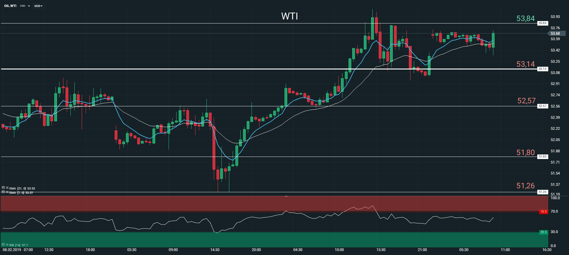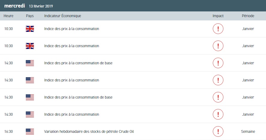 Visiblement, la hausse sur les indices européens est entretenue par l’amélioration des relations commerciales sino-américaines et l’accord sur le « shutdown » US. Concernant le calendrier économique de ce mercredi, nous prendrons connaissance de l’indice des prix à la consommation et des prix à la production du mois de janvier au Royaume-Uni. En zone euro, on s’intéressera à l’évolution de la production industrielle du mois de décembre. Du côté des Etats-Unis, la séance sera dominée par la publication de l’indice des prix à la consommation au titre du mois de janvier et des stocks hebdomadaires de brut pour la semaine terminée au 8 février. Sur le front des entreprises, la saison des résultats se poursuivra ce mercredi avec les résultats de Cisco Systems Inc, Akzo Nobel N.V, Amundi, ABN Amro group et de Barrick Gold corp.