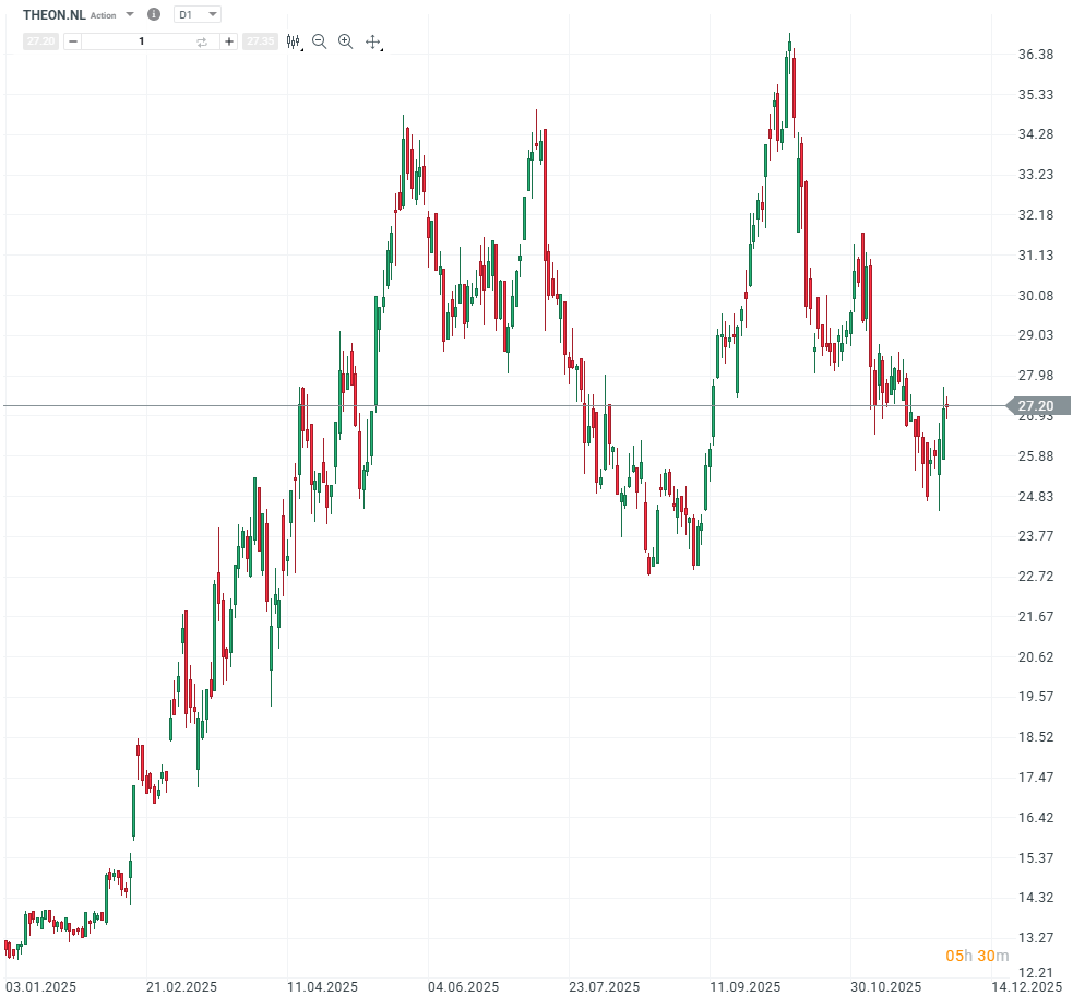 Theon devrait ouvrir en hausse demain matin après cette annonce significative. Exosens est le principal fournisseurs d'ITT de Theon. Ce composant est critique dans la fabrication des lunettes de vision nocturnes de Theon. L'entreprise chypriote avait par ailleurs procédé à des acquisitions verticales afin de réduire cette dépendance aux producteurs d'ITT, notamment en allemagne. Toutefois, la demande étant beaucoup trop importante, sa production repose encore essentiellement sur l'externalisation de la production d'ITT. Le titre avait évolué largement en hausse depuis le début de l'année, suivant le marché de la défense avec une décôte géographique (Chypre/Grèce).