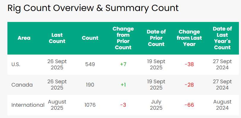 Baker Hughes, entreprise parapétrolière américaine spécialisée dans le forage horizontal, a rapporté aujourd’hui à 19h00 que le nombre total hebdomadaire de plateformes de forage actives aux États-Unis s'élève à 549, contre 542 la semaine précédente.