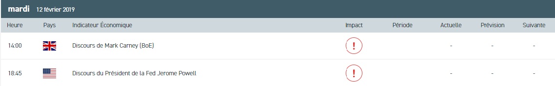 Les indices européens sont soutenus depuis l’ouverture par les espoirs d’un accord sur le plan commercial entre les Etats-Unis et la Chine et la convention de principe trouvée lundi entre les démocrates et républicains, afin d’éviter un nouveau « Shutdown ». Le calendrier économique de ce mardi sera relativement alléger. Toutefois, nous nous intéresserons à la publication du rapport mensuel de l’OPEP, aux discours de Mark Carney, gouverneur de la Banque d’Angleterre et de Jerome Powell président de la Réserve fédérale (Fed). Enfin, nous prendrons connaissance des premières estimations de stocks de pétrole pour la semaine terminée au 8 février, selon l’American Petroleum Institute (API). Enfin, les marchés asiatiques ont terminé la séance en territoire positif. Le NIKKEI 225 a gagné 2,61 % à 20 864,21 points grâce à l’affaiblissement du yen face au dollar US.