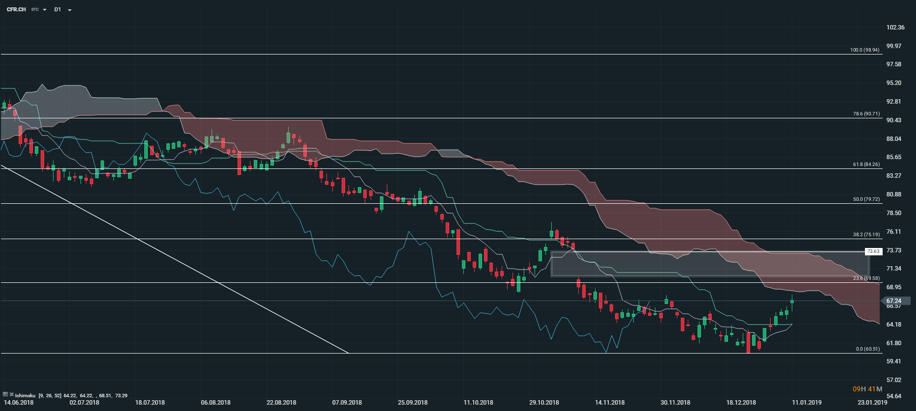 Sur le plan technique, la tendance est baissière en unité de temps journalière (D1), et ce, depuis plusieurs mois. Et pour cause, nous observons sur le graphique ci-dessus que les cours sont capés par le nuage Kumo (de l’indicateur Ichimoku). Néanmoins, cette toile de fond est susceptible de s’inverser à moyen terme car le titre est porté par la Kijun (courbe verte) et la Tenkan (courbe mauve). De plus, la Lagging-Span (courbe bleue) est orientée à la hausse et évolue désormais au-dessus des prix. L’ensemble de ces indicateurs nous laisse penser que l’action pourrait rallier le niveau des 73,63 CHF à court/moyen terme.