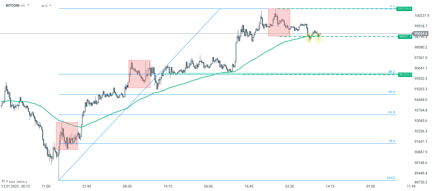 En observant un intervalle de temps plus court, le sentiment haussier reste dominant sur le graphique M15. Pour que ce sentiment soit invalidé, le prix devrait tomber en dessous du support actuellement testé à 98 827 $. Ce niveau correspond au modèle local 1:1 (rectangles verts) et à la moyenne EMA100. Toutefois, tant que le support reste défendu, un nouveau test des maxima locaux n'est pas exclu.