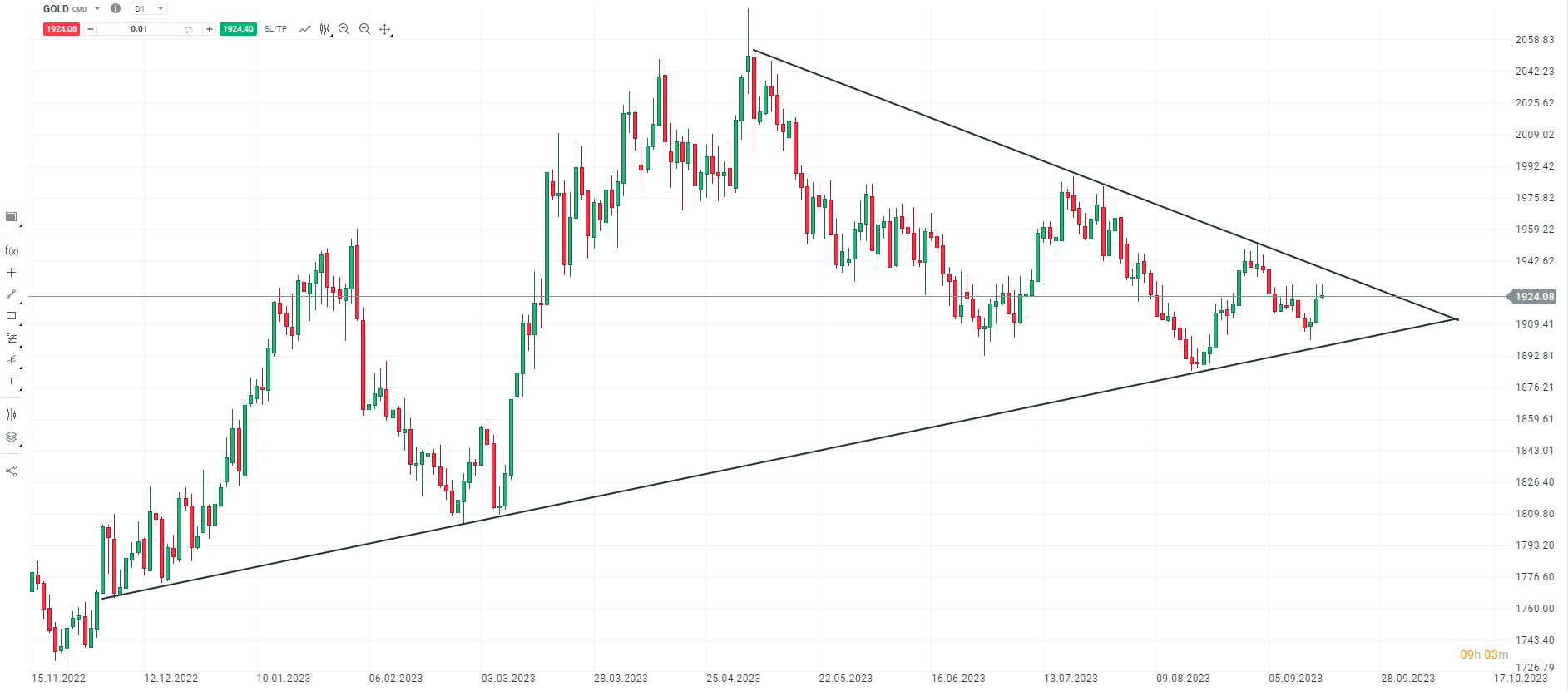 Le cours de l'or se trouve actuellement dans un triangle de compression. Une cassure à la hausse suggérerait une tendance haussière, alors qu'une cassure à la baisse suggérerait une tendance baissière. La réunion du FOMC le 20 septembre pourrait déclencher un des deux scénarios.