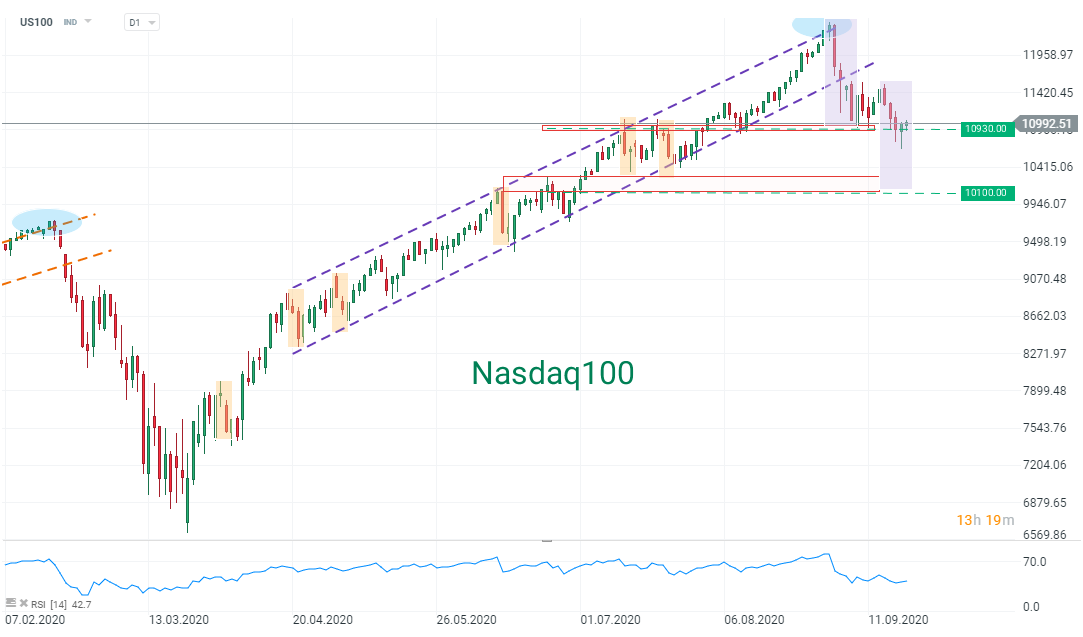 L'US100 a cassé son support clé à 10930 pts vendredi dernier, ouvrant la possibilité d'une poursuite du repli vers 10100 points. Il est intéressant de noter que les actions technologiques ont retrouvé des couleurs hier alors même que d'autres indices ont plongé, les investisseurs pensant que le retour des restrictions pourrait en fait profiter à certains d'entre eux.