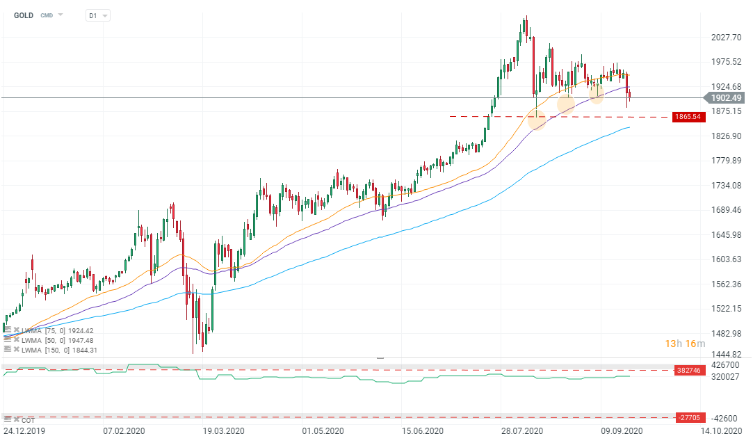 Le cours de l'or a cassé la principale moyenne mobile de 75 jours qui soutenait la tendance à la hausse. Le seuil de support n'est plus aussi manifeste à présent. Le niveau le plus probable est le creux intraday du 12 août à 1865 $, juste au-dessus de la moyenne mobile de 150 jours.