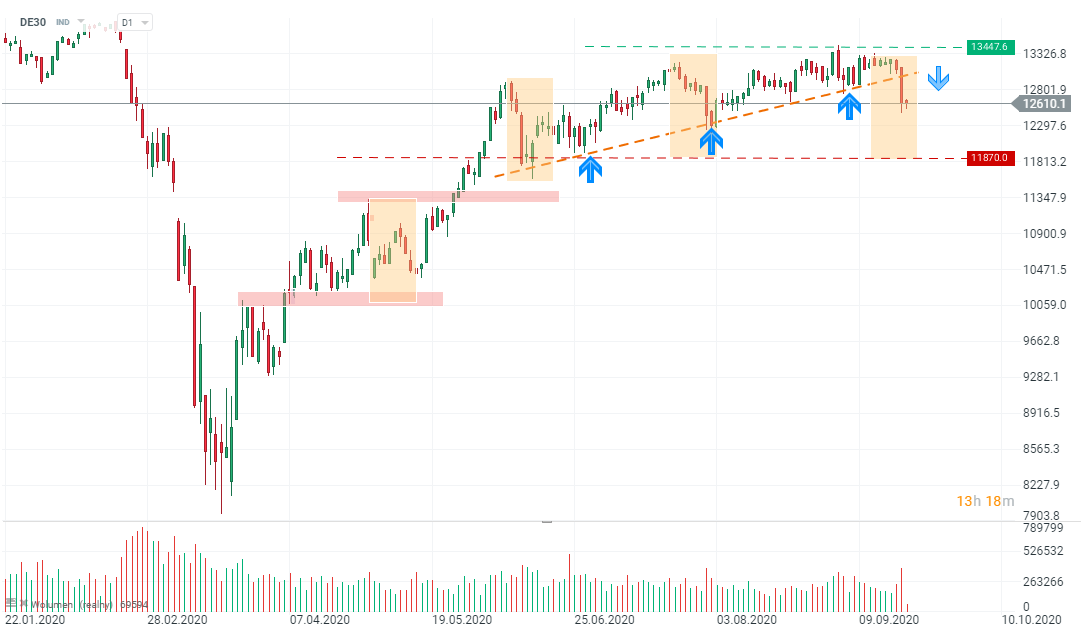 Le DE30 allemand s'est affranchi de sa formation en triangle, ouvrant la voie à une correction plus profonde. Considérant les mouvements de mai et juin, on peut tracer une ligne de support à 11870 points.