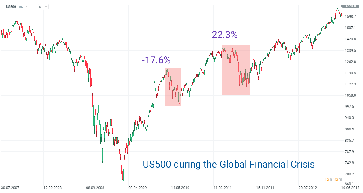 Il s'agit de la correction la plus importante à ce jour, mesurée en points, mais en pourcentage, elle se situe juste au-dessus de 10 %. C'est un niveau intéressant car pour de nombreux investisseurs, une correction de 10 % est considérée comme un bon point d'entrée. Toutefois, les deux premières corrections après la crise de 2008 ont été de 17,6 et 22,3 %, soit beaucoup plus que la correction actuelle. Cela impliquerait des niveaux de 2955 et 2787 respectivement. Bien entendu, il ne faut pas s'attendre à ce qu'une telle correction se répète avec autant de précision, mais l'histoire montre qu'une correction plus profonde est certainement possible après un fort rallye.