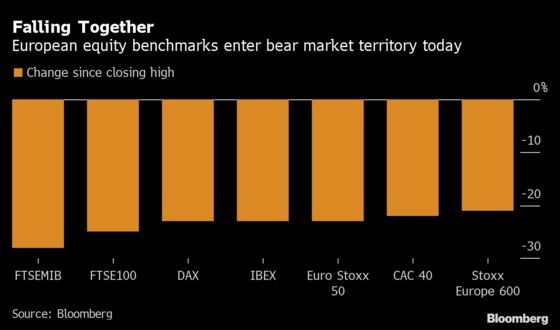 Le « sell-off » de ce lundi a entrainé les marchés européens en « bear market » après avoir franchi la barre des 20% de repli depuis les précédents sommets.