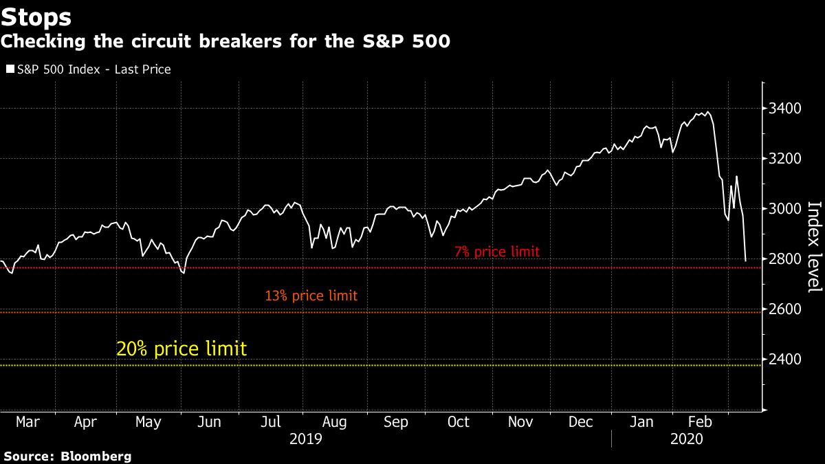 The Circuit breaker : un repli de 7% entraine une suspension de 15 minutes des cotations, un repli de 13% entraine une suspension des cotations pendant 15 minutes, un repli de 20% entraine une suspension des cotations pour le reste de la séance. Source : Bloomberg