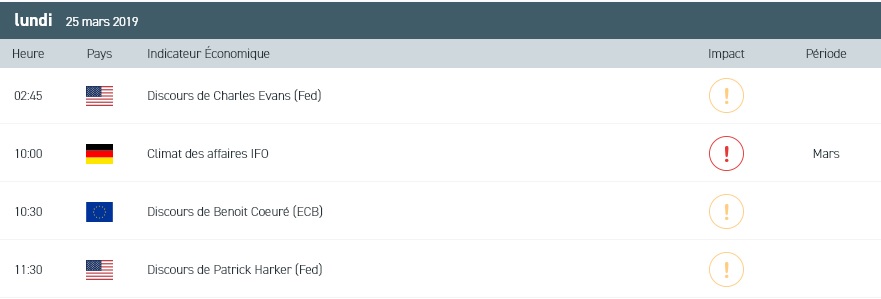 Ce lundi s’annonce profondément chargé. Entre le Brexit, le commerce sino-américain, la courbe des taux et le département de la Justice US, les opérateurs devront courir plusieurs lièvres à la fois. Concernant le calendrier économique de ce lundi, nous nous intéresserons à l’indice Ifo du climat des affaires du mois de mars en Allemagne, au discours de Benoit Coeure, membre du conseil des gouverneurs de la Banque centrale européenne et au discours de Patrick Harker, président de la Réserve fédérale de Philadelphie (Etats-Unis). En Asie, le NIKKEI 225 a terminé en baisse de 3,01 % à 20 977,11 points dans le sillage de Wall Street et de l’Europe. Aussi, l’indice a été pénalisé par le renforcement du yen face au dollar US. La paire USDJPY évolue autour des 110 ¥ pour 1 $.