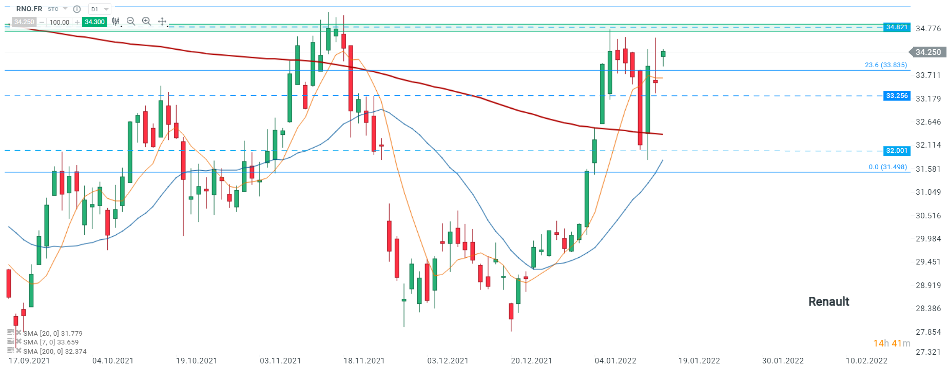 Malgré les chiffres décevants des ventes mondiales en 2021, les cours de Renault (RNO.FR) ont ouvert à la hausse, se dirigeant vers la résistance à 34,821. Si le sentiment actuel prévaut et que les cours parviennent à franchir la résistance susmentionnée, le mouvement haussier pourrait s’étendre en direction du retracement de Fibonacci à 38,2% de la baisse entamée en mars 2021. Toutefois, en cas d’échec, un retour au retracement à 23,6% ne peut être exclu. Source : xStation5