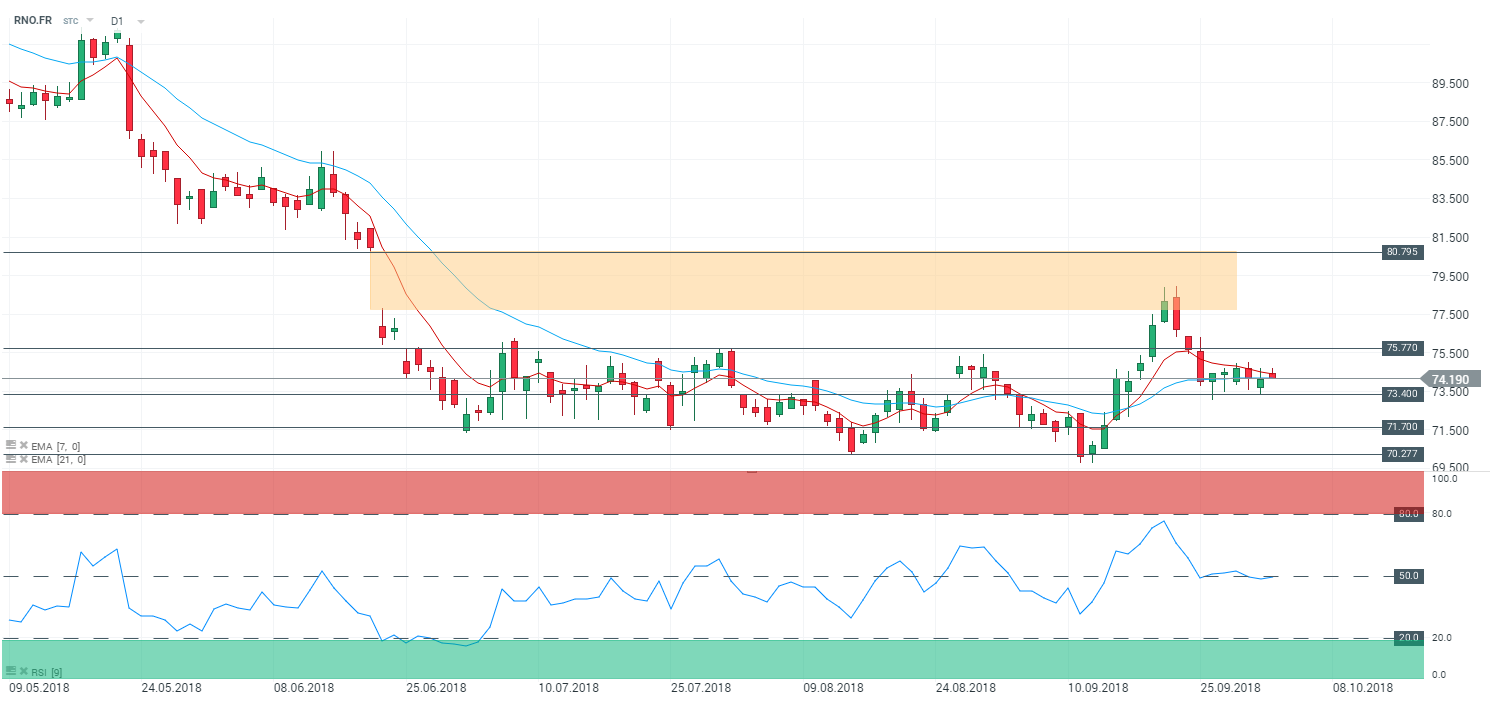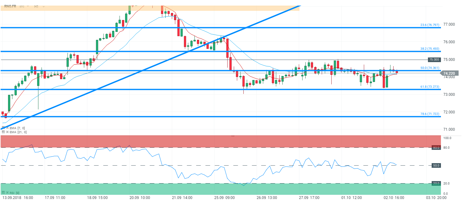 En unité de temps journalière (D1), le titre Renault (RNO.FR) évolue dans sa zone de range identifiée depuis la fin du mois de juin, à savoir entre 75,77 € et 70,27 €. Les cours sont capés par les moyennes mobiles à 7 et 21 périodes. Le RSI de son côté évolue sans tendance sur sa zone de neutralité à 49,8 points.