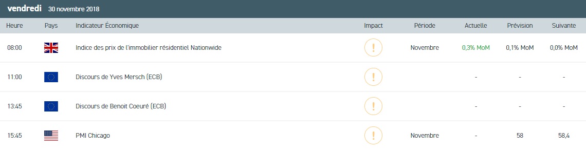 Inutile de le dire, la dernière séance de la semaine sera marquée par le sommet du G20 et la rencontre entre Donald Trump et le président chinois Xi Jiping. Concernant le calendrier économique de ce vendredi, nous prendrons connaissance de la première estimation de l’indice des prix à la consommation du mois novembre et des chiffres du chômage du mois d’octobre en zone euro. Pour les Etats-Unis, nous nous intéresserons à la publication de l’indice PMI Chicago du mois de novembre et à l’indice d’activité pétrolière de la semaine, selon Baker Hughes. Toujours sur le plan macroéconomique, la publication du produit intérieur brut (PIB) du T3 au Canada aura un effet significatif sur l’évolution de la paire USDCAD. Décryptage.