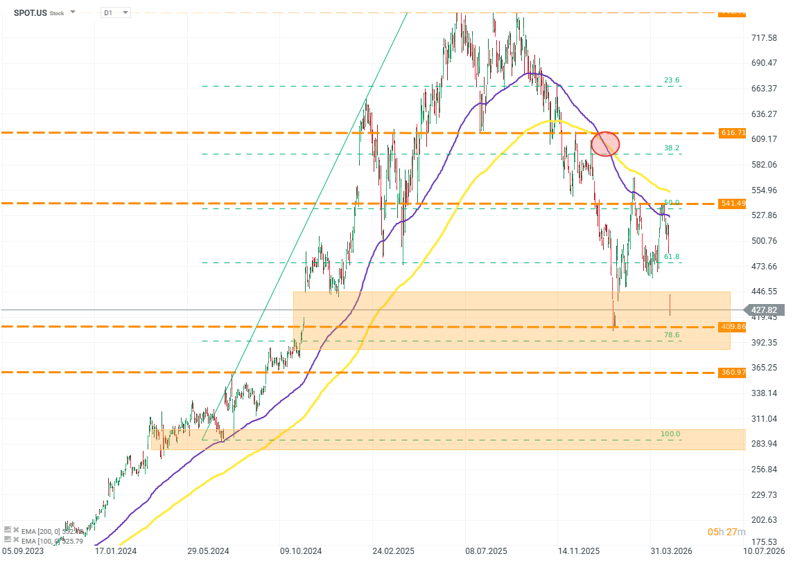 Le second semestre de 2025 s'est avéré très difficile pour Spotify. La valorisation de l'entreprise a chuté de près de 45 %, effaçant ainsi la totalité des gains enregistrés depuis le début de l'année 2025. L'ampleur de ce recul peut susciter des interrogations, interrogations que partagent les analystes des sociétés d'investissement. Compte tenu de la période concernée, la chute de la valorisation de l'entreprise pourrait s'expliquer principalement par un mouvement de capitaux vers des entreprises spécialisées dans l'intelligence artificielle. Source : xStation5