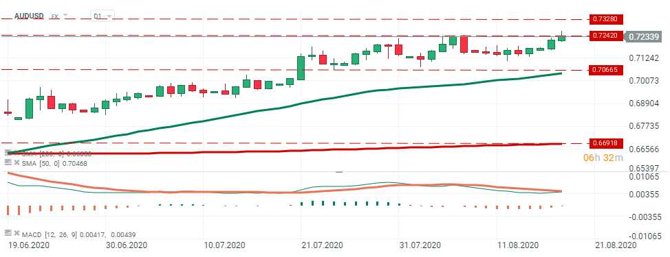 AUDUSD - La paire a franchi son plus haut niveau du mois d'août à 0,72425 et a atteint son plus haut niveau depuis février 2019. Toutefois, les acheteurs n'ont pas réussi à maintenir leur élan et la paire a reculé. En cas de baisse, un support à 0,7066 pourrait intervenir. Toutefois, si les acheteurs parviennent à reprendre le contrôle, la prochaine cible à la hausse se situera à 0,7328. Source : xStation5