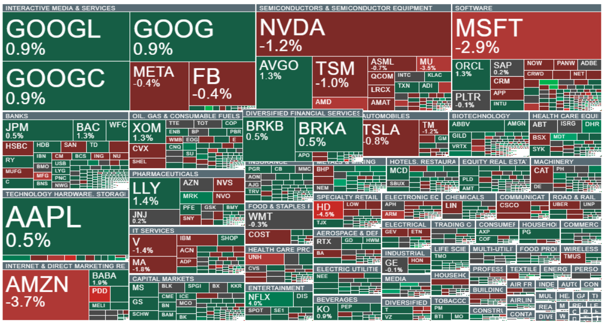 - Après une première vague de fortes ventes, les indices américains ont commencé à se redresser vers 16h00 BST. L’US500 est désormais en baisse de moins de 0,2 %, contre près de -1,1 % peu après l’ouverture de Wall Street. Le secteur technologique reste toutefois sous pression, avec Microsoft et Amazon en tête des baisses.