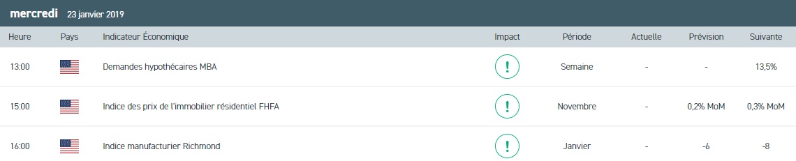 Pour la troisième fois de la semaine, les indices sont en territoire négatif. La correction s’explique par les informations relayées par le Financial Times selon lesquelles les Etats-Unis auraient rejeté une proposition de Pékin d’envoyer deux émissaires chinois afin de préparer les discussions de la semaine prochaine. Bien que cette information ait été démentie par Larry Kudlow, les indices refusent (pour le moment) de regagner du terrain. Le calendrier économique de ce mercredi sera peu fourni en statistiques économiques. Nous nous intéresserons seulement aux ventes au détail du mois de novembre au Canada et aux premières estimations de stocks de pétrole pour la semaine terminée au 18 janvier, selon l’American Petroleum Institute (API). Du côté des entreprises, nous prendrons connaissance des résultats de Procter & Gamble, Comcast, United Technologies, Texas Instrument et Ford Motors.
