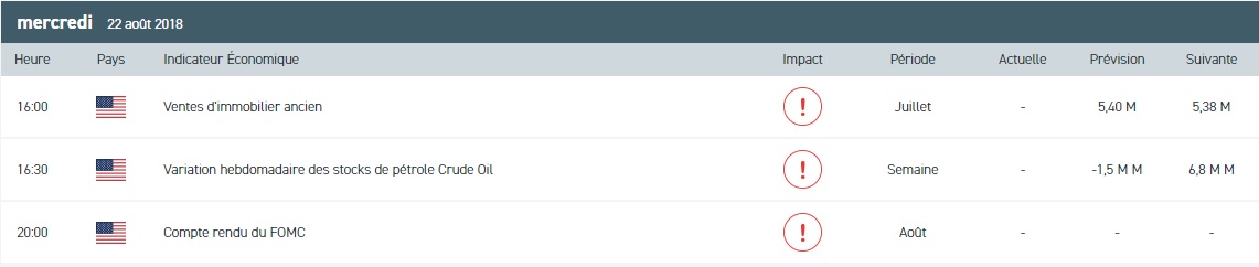 Les marchés européens sont baissiers ce matin en raison des déboires judicaires de Michael D.Cohen, ancien avocat personnel de Donald Trump. Celui-ci a plaidé coupable mardi pour des chefs d’accusation qui pourraient directement impacter le président des Etats-Unis. Sur le front de la macroéconomie, nous nous intéresserons à la publication des ventes au détail du mois de juin au Canada, des ventes de logements du mois de juillet et les stocks hebdomadaires de pétrole aux Etats-Unis. Evidemment, les points d’orgue de la séance seront la parution du compte-rendu de la dernière réunion de politique monétaire de la Réserve fédérale (Fed) et la rencontre sino-américaine concernant la thématique commerciale.