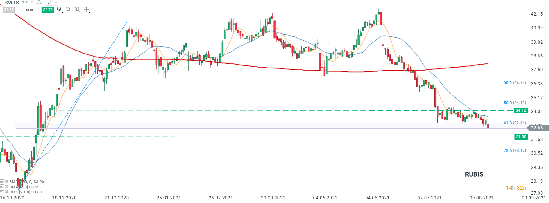 Les cours de Rubis (RUI.FR) continuent d’évoluer dans une tendance baissière, tentant de casser le niveau de retracement de Fibonacci à 61,8% (32,84) de la hausse entamée le 29/10/20. En cas de cassure de ce niveau, le mouvement baissier pourrait s’étendre en direction de la précédente zone de support à 31,90. Toutefois, si les acheteurs prennent le contrôle, la zone de résistance à 34,12 constitue la prochaine cible. Source : xStation5