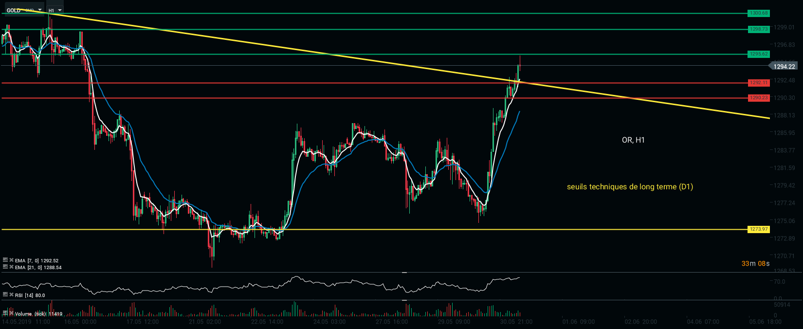 L’or est reconnu comme étant la valeur refuge par excellence. Nous pouvons voir un pic à la hausse du métal jaune ces dernières heures. Les menaces de Trump contre le Mexique, le discours ferme de Pékin et les dernières données macroéconomiques en Allemagne ont tendance à ne pas rassurer les marchés. De plus, la chute du rendement des taux 10 ans allemand et américain (2,17 %) accentue cette ruée vers le « métal jaune ». Pour l’heure, la Bourse de Paris recule de plus de 1 %. Les valeurs cycliques (valeurs les plus sensibles à la conjoncture mondiale) lestent le CAC40. Renault (RNO.FR) cède 4 % en séance.