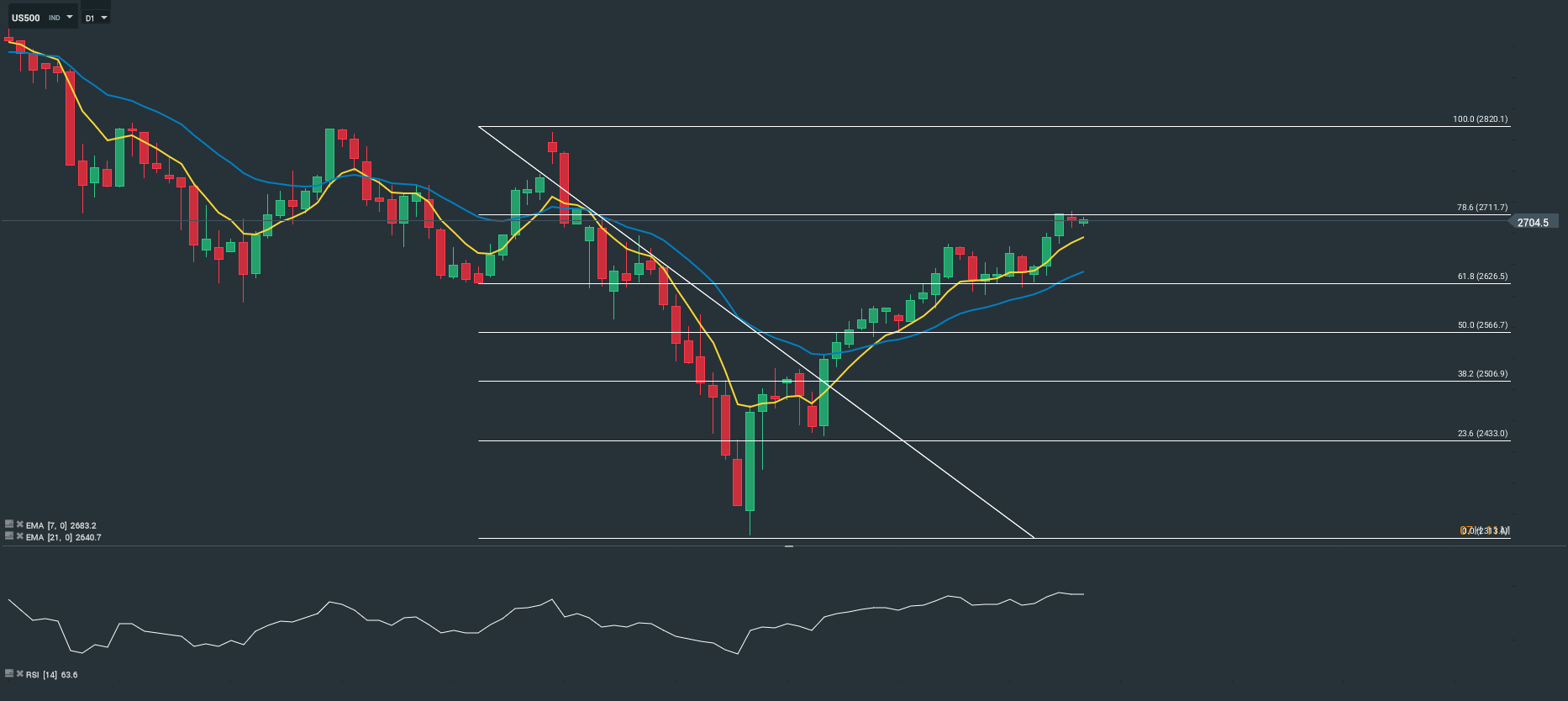 En période journalière (D1), le S&P500 évolue en tendance haussière. Il est soutenu par les moyennes mobiles à 7 et 21 périodes. Le RSI est orienté à la hausse. Il est très probable qu’à court terme l’indice rallie le niveau 78.6% des retracements de Fibonacci (soit 2715 points).