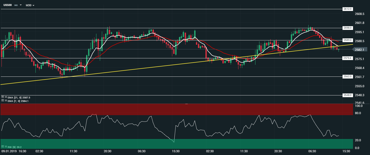 En unité de temps 30 minutes (M30), l’indice S&P 500 (US500) évolue en tendance haussière. Les cours sont capés par les moyennes mobiles à 7 et 21 périodes. Le RSI est orienté à la hausse et oscille à 28,7 points. Dans ce contexte, nous serons baissiers sur l’actif, avec comme objectif le niveau des 2 562 points.