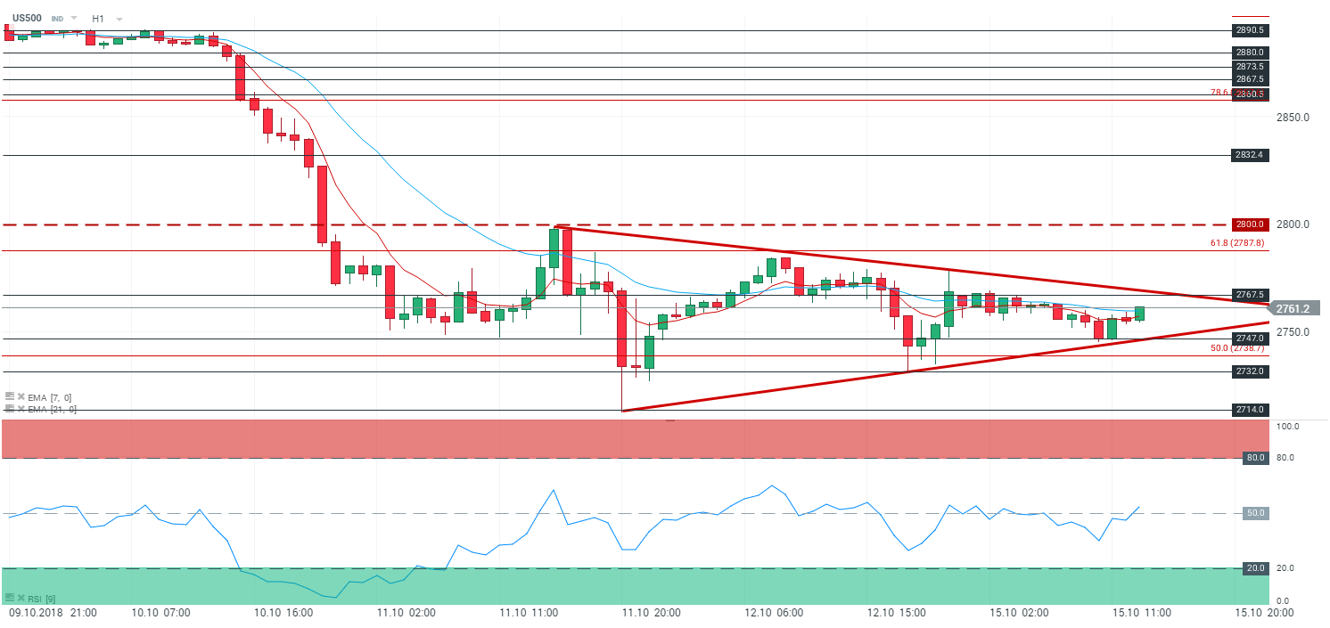 En unité de temps horaire (H1), les cours évoluent dans une zone de range comprise entre 2 787 points et 2 740 points. De plus nous les cours sont compris au sein d’un triangle symétrique. Pour l’heure les prix sont soutenus par les moyennes mobiles à 7 et 21 périodes. Le RSI évolue à la hausse sur sa zone de neutralité à 51,2 points.