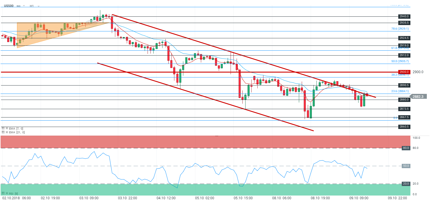 En unité de temps horaire (H1), l’indice S&P 500 (US500) évolue en tendance baissière toujours au sein de son canal baissier. Les cours sont capés par les moyennes mobiles à 7 et 21 périodes. De plus le RSI est orienté à la baisse et oscille dans sa zone de neutralité à 45,1 points. Dans ce contexte nous avons un biais baissier sur l’indice avec en ligne de mire le niveau des 2 874 points – et par extension le niveau des 2 868 points.