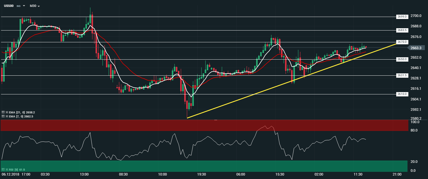 En unité de temps 30 minutes (M30), l’indice S&P 500 (US500) évolue en tendance haussière au sein d’un triangle ascendant. Les cours sont portés par les moyennes mobiles à 21 et 7 périodes. Le RSI est orienté à la baisse et oscille à 61,9 points. Dans ce contexte, et en cas de franchissement de la zone de résistance des 2 670 points, nous serons haussiers sur l’indice avec comme objectif le niveau des 2 683 points - et par extension le niveau des 2 700 points.