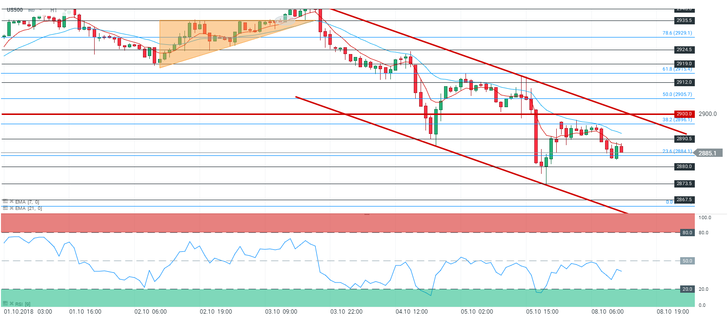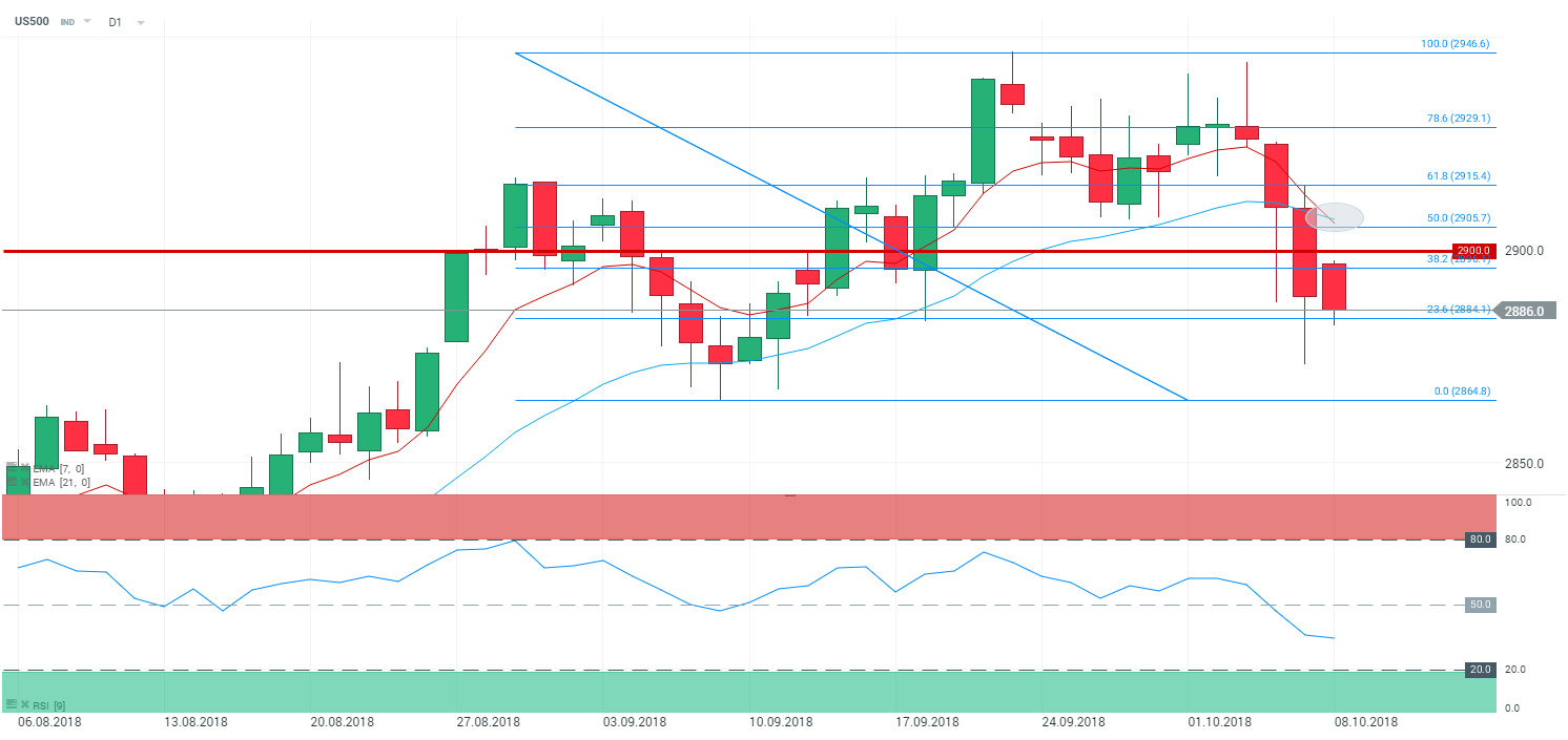 Le S&P 500 (US500) évolue en territoire négatif. Et pour cause les « trop bons » chiffres concernant la hausse des salaires aux Etats-Unis font craindre aux opérateurs de nouvelles hausses de taux d’intérêt de la part de la Fed. C’est pour cette raison que les opérateurs ont vendu les marchés américains vendredi. Cette semaine ne sera pas moins compliquée, puisque les investisseurs auront les yeux braqués ce jeudi sur les données concernant l’indice des prix à la consommation aux Etats-Unis – comprenez l’inflation. En cas de remontée de l’inflation, cela devrait enfoncer le clou de nouvelles hausses des taux d’intérêt de la part de la Réserve Fédéral. De plus les tensions commerciales sino-américaines commencent à impacter la Chine qui se voit contrainte d’abaisser le taux de réserve obligatoires des banques afin de stimuler l’octroi de crédit aux entreprises et par voie de conséquence la consommation des ménages chinois. Malgré cette annonce, les indices asiatiques ont plongés cette nuit, de quoi raviver les craintes d’une contagion aux autres marchés, notamment américains.