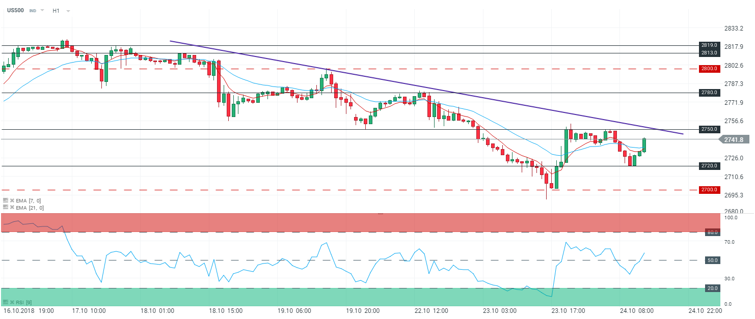 Une tentative de rebond se dessine sur l’ensemble des indices, dont le S&P 500. Cependant la trame de fond reste baissière. Les mauvais résultats publiés par certaines entreprises américaines lors de la séance de la veille, continuent de peser sur l’indice. De plus, nous notons qu’hier soir Raphael Bostic - Président de la Réserve fédérale d’Atlanta - a déclaré que la Fed n’a plus besoin de « garder le pied sur l’accélérateur ». Le contexte baissier reste inchangé puisque les opérateurs sont toujours inquiets du ralentissement de la croissance chinoise.